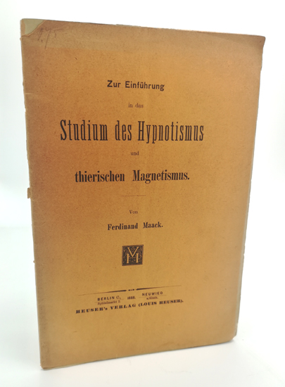 Maack, Dr. med. Ferdinand: Zur Einführung in das Studium des Hypnotismus und tierirschen Magnetismus. Heuser’s Verlag (Louis Heuser), Berlin u. Neuwied 1888. Gr.-8°. 2 Bl., 27 S., 1 Bl. Vlgs.-Anz. OKarton.
