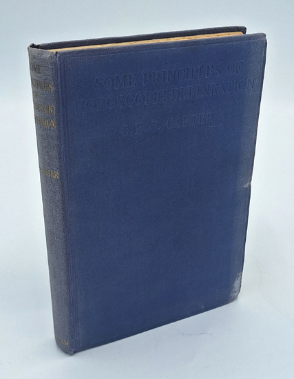 Carter, Charles E. O.: Some Principles of Horoscopic Delineation. Together with Chapters on Infant Mortality and Longevity, Suicide and Insanity, and Violent Crime. W. Foulsham & Co. Ltd., London 1934. 136 S. Blue cloth binding with cover blindstamped and gold embossing on the spine.