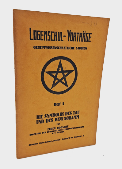 Grosche, [Otto Max] Eugen: Die Symbolik des Tau und des Pentagramm. Okkulter Buch-Verlag „Inveha“, Berlin o. J. (1929). Mit 15 Abbildungen im Text. 28 S., 3 S. Vlgs.-Anz., 1 [w]. Illustr. OKarton.
