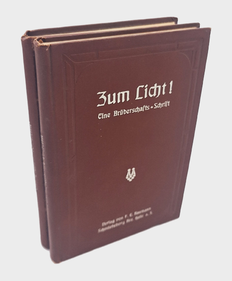 Baumann, F[riedrich] E[duard] u.a. (Hrsg.): Zum Licht! (″Gott mit uns“). Eine Bruderschafts-Schrift. (Heft 79-90 = Band 14 u. 15). Verlag von F[riedrich] E[duard] Baumann, Bad Schmiedeberg und Leipzig o.J. [1911-?]. Herausgegeben unter Mitwirkung von Dr. phil. P[eter] Braun, P[eter] Ch[ristoph] Martens und anderer Freunde der Wahrheit und des Fortschritts von F[riedrich] E[duard] Baumann. 1 Bl., 288 S. u. 272, 16 S. [= 1. Lieferung von: „Ahrinziman. Eine selsame Geschichte“, von Anita Silvani]. Braune OLwd.-Bände.