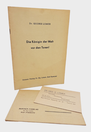 Lomer, Dr. Georg [Heinrich]: Die Königin der Welt vor den Toren! Im Sonnen-Verlag Dr. Gg. Lomer, Bad Pyrmont 1951. 24 S. OKarton.
