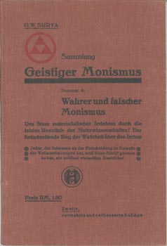 Surya, G. W. (Ps) = Demeter Georgiewitz Weitzer: Wahrer und falscher Monismus. Der Sturz materialistischer Irrlehren durch die letzten Resultate der Naturwissenschaften ! Der fortschreitende Sieg der Wahrheit Über den Irrtum. Verlag Peter Hofmann, Freiburg im Breisgau 1935. Zweite, vermehrte und verbesserte Auflage. 1 Bl., 94 S., 1Bl. Vlgs.-Anz., Illustr. OLwd.