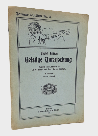 Fritsch, Theod[or]: Geistige Unterjochung. Zugleich eine Antwort an Dr. G. Lomer und Prof. Werner Sombart. Hammer-Verlag (Th. Fritsch), Leipzig 1913. 5. Auflage. 42.-51. Tausend. Gr.-8°. 24 S. OBroschur.