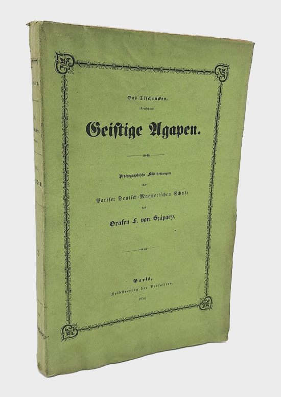 Das Tischrücken (Fortsetzung). Geistige Agapen. Psychographische Mittheilungen der Pariser Deutsch-Magnetischen Schule des Grafen F. von Szápary. Selbstverlag des Verfassers [Buchdruckerei von W. Remquet und Comp.], Paris 1854. 4°. XXIV, 324 S., 2 Bl., 1 (w) OKarton.