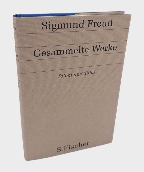 Freud, Sigmund: Gesammelte Werke. Chronologisch geordnet: 9. Band: Totem und Tabu. S. Fischer Verlag, Frankfurt am Main 2012. Neunte Auflage. 1 Bl., 206 S., 4 Bl., 1 (w). OLwd. mit Rückengoldprägung und OUmschlag.