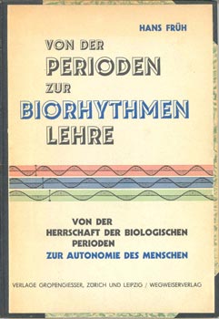 Früh, Hans: Von der Perioden- zur Biorhythmenlehre. Von der Herrschaft der biologischen Perioden zur Autonomie des Menschen. Zürich u. Lpz., Gropengiesser / Wegweiservlg. [1942]. Mit 1 farb. Taf., 1 gef. Taf. u. Textabb. 143 S. HLwd. d.Zt. mit aufgezogenem OUmschl.