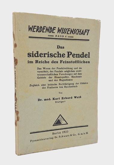 Werdende Wissenschaft. Eine Sammlung von Einzelarbeiten auf umstrittenen Wissensgebieten. Band 6. – Verinnerlichung S. 76 (Wegweiser der Geistes- und Geheimwissenschaften – Erste Folge 1926). – Vollständiger Titel: Das siderische Pendel im Reiche des Feinstofflichen. Das Wesen der Pendelwirkung und die vermittels des Pendels möglichen exaktwissenschaftlichen Forschungen auf dem Gebiete der Homöopathie, Biochemie und des Magnetismus. Zugleich eine kritische Rechtfertigung der Odlehre des Freiherrn von Reichenbach. – Inhalt: Einleitung. I. Versuch der Erklärung der Pendelschwingungen und des Ausschlags der Wünschelrute. II. Nervosität und Sensibilität. III. Steigerung der Empfindlichkeit durch Medikamente. IV. Beschreibung einiger Versuche mit der Wünschelrute. V. Das Pendel. VI. Systematische Beschreibung der Pendelversuche. VII. Das Gesetz der Hemmung. VIII. Der menschliche Körper, Bilder, Briefe, Handschriften. IX. Der Lebensmagnetismus. X. Untersuchung feinstofflicher und grobstofflicher Substanzen. XI. Praktische Bestimmung des passenden homöopathischen oder biochemischen Mittels durch das Pendel. XII. Was hat das Pendel mit Homöopathie oder Biochemie zu tun? Anhang: Kritische Rechtfertigung der Odlehre des Freiherrn von Reichenbach durch das Pendel. – Umschlag mit geringen Randläsuren, Rücken stellenweise Braunfleckig. Innen sauberes Exemplar.
