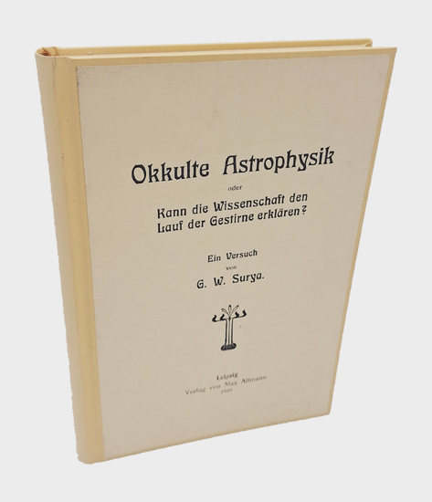 Surya, G. W. (Ps.) = Demeter Georgiewitz-Weitzer: Okkulte Astrophysik oder Kann die Wissenschaft den Lauf der Gestirne erklären? Ein Versuch. Verlag von Max Altmann, Leipzig 1910. Mit 3 Textfiguren. XII, 176 S., 4 Bl. Vlgs.-Anzeigen. Priv. Pappband mit aufgezogener OBroschur.
