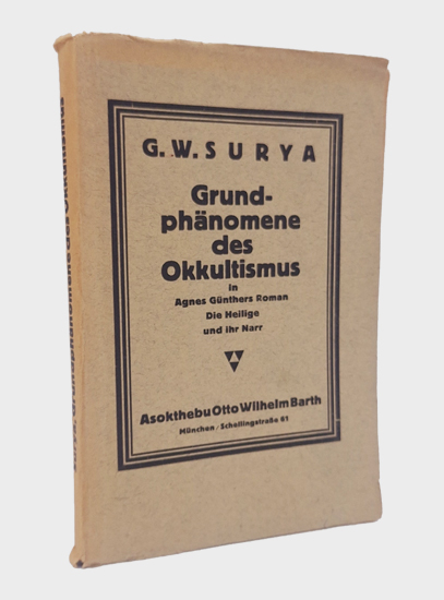 Surya, G. W. (Ps.) = Demeter Georgiewitz-Weitzer: Das Okkulte in Agnes Günther. “Die Heilige und ihr Narr” erläutert an zahlreichen, ähnlichen wohlbeglaubigten Tatsachen und eigenen übersinnlichen Erlebnissen des Verfassers. Verlag Fr. Paul Lorenz, Freiburg (Baden) 1921. 1. Auflage. (1.-3. Tausend). 157 S., 3 S. Vlgs.-Anz. OKarton.