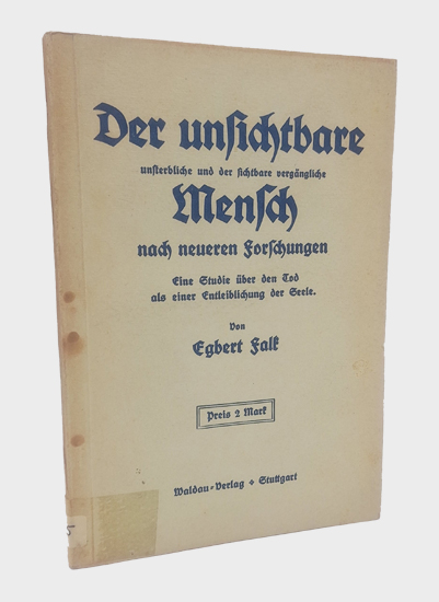 Falk, Egbert: Der unsichtbare unsterbliche und der sichtbare vergängliche Mensch nach neueren Forschungen. Eine Studie über den Tod als einer Entleiblichung der Seele. Waldau Verlag H. C. Wälde, Stuttgart o.J. [um 1935]. 95 S. OKarton.