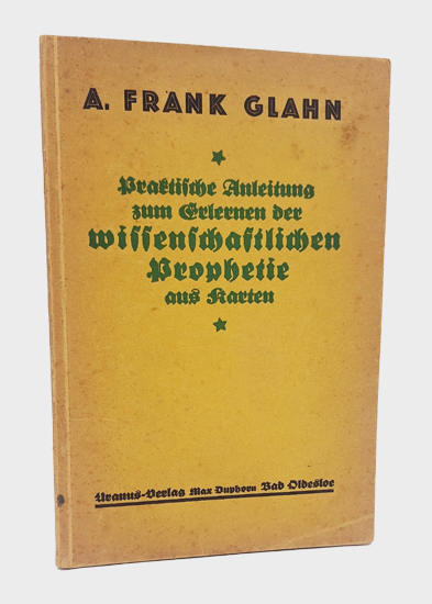 Glahn, A[ugust] Frank: Praktische Anleitung zum Erlernen der wissenschaftlichen Prophetie aus Karten. Uranus Verlag Max Dubhorn, Bad Oldesloe 1925. 68 S., 2 Bl. Vlgs.-Anz. OKarton.