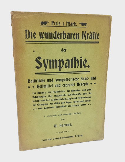 Hartung, A.: Die wunderbaren Kräfte der Sympathie. […]. Ernst’sche Verlagsbuchhandlung, Leipzig o.J. [um 1902]. 4. verbesserte und vermehrte Auflage. XIII, 3 Vlgs.-Anz., 118 S., 1 Bl. Vlgs.-Anz. OKartonage.