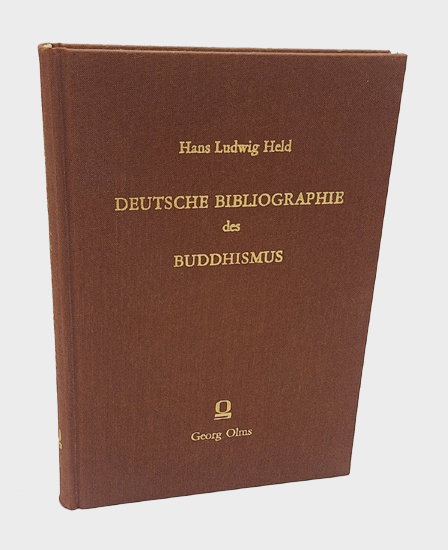 Held, Hans Ludwig: Deutsche Bibliographie des Buddhismus. Eine Übersicht über deutschsprachliche buddhistische und buddhologische Buchwerke, Abhandlungen, Vorträge, Aufsätze, Erwähnungen, Hinweise und Rezensionen mit ausschließlicher Berücksichtigung des Buddhismus als Religionswissenschaft. Georg Olms Verlag, Hildesheim 1973. VIII, 190 S., 1 (w). OLwd. mit Goldprägung.