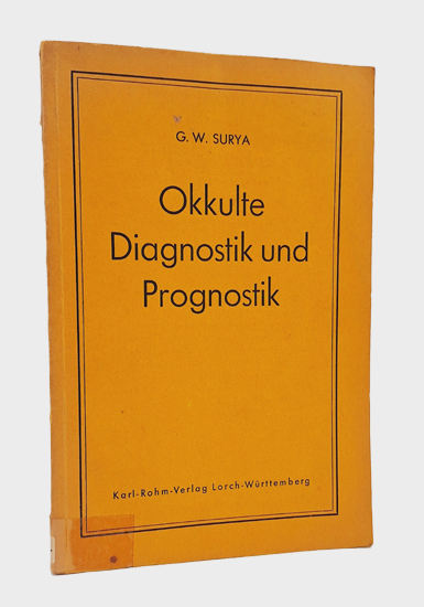 Surya, G. W. (Ps) = Demeter Georgiewitz Weitzer: Okkulte Diagnostik und Prognostik. Verlag von Karl Rohm, Lorch 1950. Fünfte erweiterte Auflage. Mit einem Schaubild [Falttafel, in Buchlasche] zur Augendiagnose. 222 S., 1 Bl. Vlgs.-Anz. OKartonage.