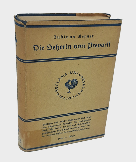 Die Seherin von Prevorst. Eröffnungen Über das innere Leben des Menschen und Über das Hereinragen einer Geisterwelt in die unsere. Verlag von Philipp Reclam jun., Leipzig o. J. [um 1910]. Kl.-8°. Mit neun Tafeln. Mit einer biographischen Einleitung von Dr. Carl du Prel. 630 S., 1 Bl. Vlgs.-Anz. OHLwd. mit OUmschlag.