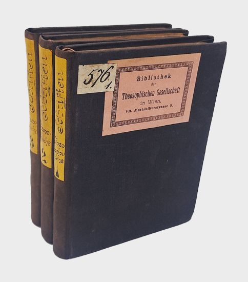 Ackermann II, 666. Verinnerlichung S. 108. (Wegweiser der Geistes- und Geheimwissenschaften – Erste Folge 1926). Zu den Titeln von Hartmann siehe Hütwohl S. 14, 15, 30/31 u. 39. – Enthält: Band 1: I. Annie Besant: Die Sphinx der Theosophie. II. [Dr. Wilhelm] Hübbe-Schleiden: Karma. Die theosophische Begründung der Ethik. III. Chakravarti, Gyanendra Nath: Der Weltberuf der “Theosophischen Gesellschaft”. Ein Vortrag. IV. Hübbe-Schleiden: Karma im Christentum. V. Hübbe-Schleiden: Die Lehre der Wiederverkörperung im Christentum. VI. Göring, Hugo: Dr. Franz Hartmann, ein Vorkämpfer der Theosophie. & Hartmann, Franz: Selbsterkenntnis und Wiederverkörperung. VII. Ewald, Dr. Ernst: Theosophie gegen Anarchie. & Theosophie und Anarchie. Offener Brief an Herrn Dr. Ernst Ewald. VIII. Landgerichtsrat Krecke: Wie die Theosophie dem sittlichen und sozialen Elend entgegenwirkt. IX. Besant Annie: Theosophie und soziale Fragen. Rede auf dem Theosophen-Kongreß zu Chicago gehalten. X. Hübbe-Schleiden: Die geistige und geschichtliche Bedeutung der theosophischen Bewegung. Band 2: XI. Mead, G[eorge] R[obert] S[tow]: Yoga, die Wissenschaft der Seele. XII./XIII. Hartmann, Franz: Mystik und Weltende. XIV./XV. Deinhard, Ludwig (Übersetzung): Ein Interview über Theosophie zwischen einem Berichterstatter des “New York World” und Annie Besant. XVI./XVII. Koeber, Raphael von: Der Gedanke der Wiederverkörperung ein durchlaufender Faden im Geistesleben des alten Hellas. XVIII. Hartmann, Franz: Gedanken über die Theosophie und die “Theosophische Gesellschaft”. XIX. Friedrichsort, Werner: Dr. Hübbe-Schleidens Weltanschauung. XX. Hartmann, Franz: Die Feuerbestattung, betrachtet vom Standpunkte der Religionen des Ostens. Band 3: XXI. Tolstoy, Graf Leo: Religion und Moral. XXII./XXIII. Besant, Annie: Symbolik. Vortrag. XXIV. Landgerichtsrat Hermann Krecke: Weltverbesserung. XXV. Dietel, Ernst: Gedanken über das Karma. XXVI. Dietel, Ernst: Buddhismus und Christentum. XXVII. Göring, Dr.: Erziehung zu religiösem Leben. XXVIII. Wolf, Richard: Mensch, Tier und Vivisektion. XXIX./XXX. Besant, Annie: Die Mahâtmâs, ihre thatsächliche Existenz und das von ihnen verkörperte Ideal. – Exemplare aus der Bibliothek der Theosophischen Gesellschaft in Wien, eingebunden in die üblichen sehr stabilen u. robusten schwarzen Leineneinbände mit Dck.– u. Rck.– Schild(ern). – Einbände leicht berieben, bestoßen und fleckig. Papier schwankend gebräunt. Bis auf Heft 1 die OUmschläge mit eingebunden. So komplett sehr selten.