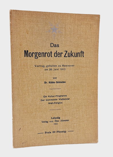 Vortrag, gehalten zu Hannover am 20. Juni 1912. – Enthält u.a.: Ein Kulturprogramm. Der kommende Weltlehrer. Welt-Religion. – Umschlag gering berieben, minimal bestoßen und fleckig. Innendeckel mit Widmung von Hübbe-Schleiden in Tinte. Selten.