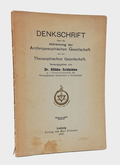 Hübbe-Schleiden, Dr. [Wilhelm] (Hrsg.): Denkschrift über die Abtrennung der Anthroposophischen Gesellschaft von der Theosophischen Gesellschaft. Verlag von Max Altmann, Leipzig 1913. 95 S. OKarton.