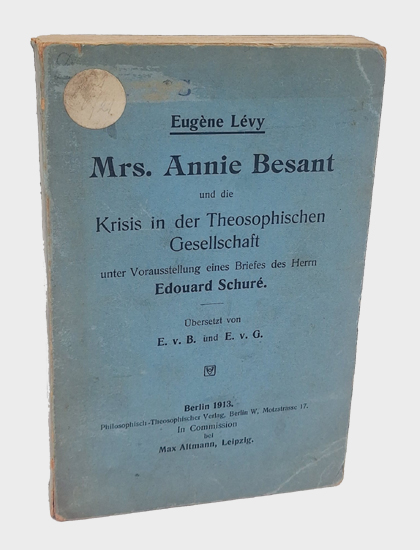 Lévy, Eugène: Mrs. Annie Besant und die Krisis in der Theosophischen Gesellschaft. Unter Vorausstellung eines Briefes des Herrn Edouard Schuré. Philosophisch-Theosophischer Verlag, Berlin 1913 (In Commission bei Max Altmann, Leipzig). Übersetzt von E.v.B. und E.v.G. 2 Bl., 186 S., 3 Bl. OKarton.