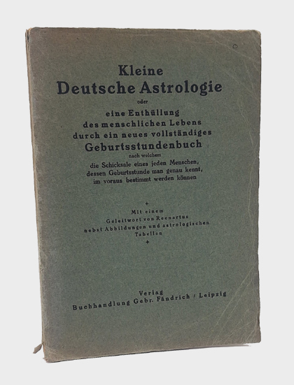 Kleine Deutsche Astrologie oder eine Enthüllung des menschlichen Lebens durch ein neues vollständiges Geburtsstundenbuch nach welchem die Schicksale eines jeden Menschen, dessen Geburtsstunde man genau kennt, im Voraus bestimmt werden können. Buchhandlung Gebr. Fändrich, Leipzig o.J. (um 1925/27). Mit einem Geleitwort von Recnartus (d.i. Heinrich Tränker) nebst Abbildungen und astrologischen Tabellen. VI, 1 Bl., 147, [1] S. OKarton.