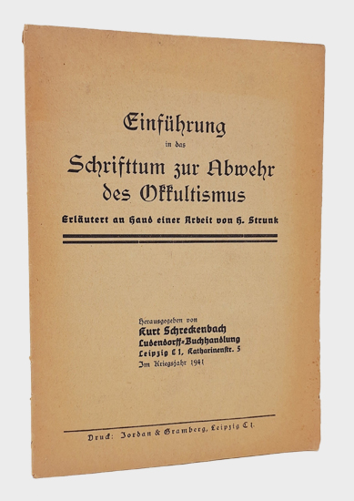 Schreckenbach, Kurt (Hrsg.): Einführung in das Schrifttum zur Abwehr des Okkultismus. Erläutert an Hand einer Arbeit von H. Strunk. Ludendorff-Buchhandlung, Leipzig 1941. 31 S. OBroschur.