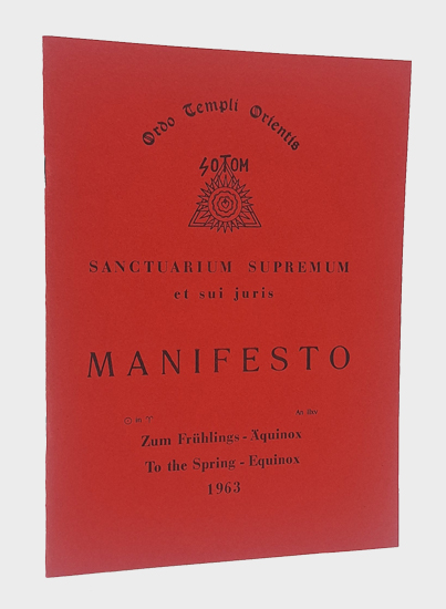 Ordo Templi Orientis. Sanctuarium Supremum et sui juris. Manifesto. Verlag Psychosophische Gesellschaft, Zürich 1963. [20] S. OKarton.