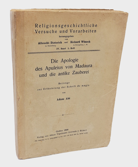 Die Apologie des Apuleius von Madaura und die antike Zauberei. Beiträge zur Erläuterung der Schrift de magia von Adam Abt. Verlag von Alfred Töpelmann (vormals J. Ricker), Gießen 1908. VII, [1], 271, [1] w. S. OKartonage.
