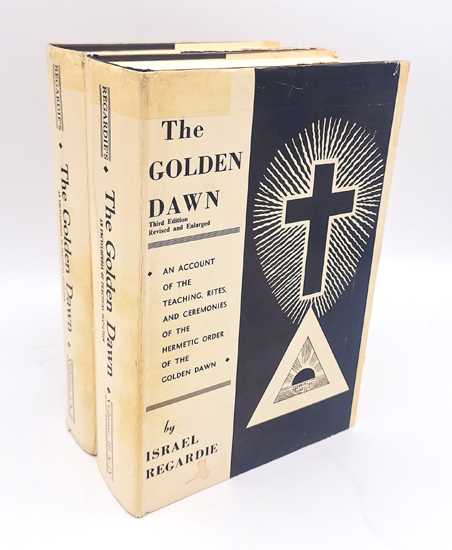 Regardie, [Francis] Israel: The Golden Dawn. An Account of the Teachings, Rites and Ceremonies of the Order of the Golden Dawn. Volume 1-4 in 2 Volumes. Publisher: Hazel Hills Corporation, River Falls, Wisconsin. Trade Distributor: Llewellyn Publications, Saint Paul, Minnesota, 1970. Third Edition, Revised & Enlarged. Gr.-8°. With numerous illustrations & diagrams in the text. – Volume One & Two: With 4 coloured plates. [12], XIV, S. 13-226, [2] S.; With 2 plates. [10], S.11-300. – Volume Three & Four: [6], XVI, [2], S. 9-276, [4] S.; [10], S. 11-368. Black cloth with gilt-stamped spine title and with illustrated original dust jackets.