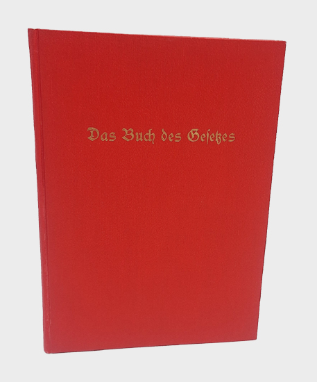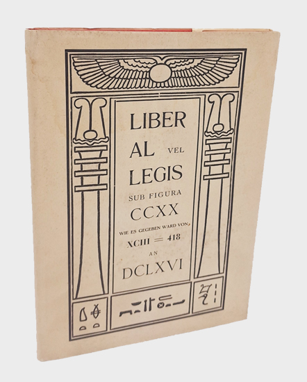 Herausgegeben im Auftrage der Grossen Weissen Bruderschaft als A.·.A.·. bekannt. Limitierte Auflage. Von 1000 Expl. ist dies Buch Nr. 18 (Umschlag mit Nr. 166). „Diesem Buch des Gesetzes gaben wir ein seinem Inhalt würdiges Kleid. Aleister Crowley legte stets großen Wert auf die äußere Gestaltung, und sein Grundsatz war: Nur das Beste ist gut genug.“ (aus: 10 Jahre Verlag Psychosophische Gesellschaft). – Frühe Ausgabe (Nummer) die sich von späteren Ausgaben durch etwas dickere Deckel, ein gröberes Leinen und eine leicht vergrößerte Deckelgoldprägung unterscheidet. – Umschlag gebräunt, schwach berieben und leicht fleckig (schwacher, alter Wasserrand), sonst ein gutes Exemplar.