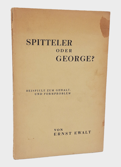 Ewalt, Ernst: Spitteler oder George? Beispiele zum Gehalt- und Formproblem. Buchverlag “Inveha”, Berlin 1930. 124, [1], 1 w. S., 1 Bl. Vlgs.-Anz. OKarton.