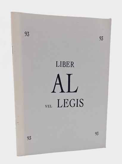 AL (Le Livre de la Loi) sub figura xxxi tel qu’il fut transmis par 93 – AIWASS – 418 à Ankh-f-n-khonsu Le Prêtre des Princes qui est 666. Pas d’éditeur, pas de date [ca. 1980]. xiii, [1] w., 55 S. Carton.