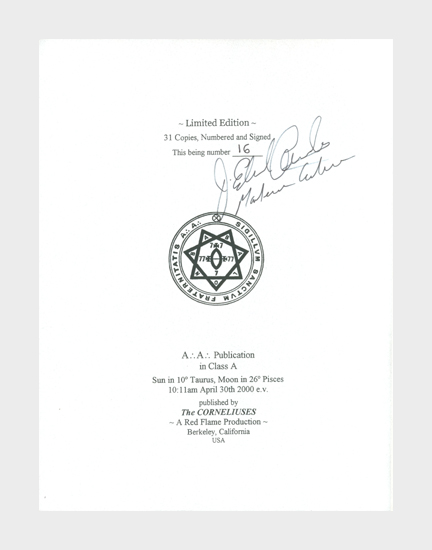 Limited Edition. 31 (hand-numbered) Copies, Numbered and Signed [by Marlene Cornelius and Jerry Cornelius]. This being number 16. – Contains a short foreword by Frater Achad Osher 583 (Jerry Cornelius). – A very few minimal stains on the lower transparent cover, otherwise a very good copy. Scare.