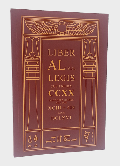 Contains a Greek translation of Liber AL side by side with the English text, as well as the facsimile of the manuscript and b/w photographs of the Stele. – As new, with a small bump on the upper spine.