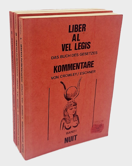 LIBER AL vel LEGIS. Das Buch des Gesetzes. Kommentare von Crowley / Eschner. Band I-III (in 3 Bdn.). “Stein der Weisen” Verlag Sigrid Kersken-Canbaz, Berlin 1982. 222 S., 6 Bl. Vlgs.-Anz., 1 (w); 210 S., 1 (w); 218 S., 1 (w) rote illustr. OKarton Bände.