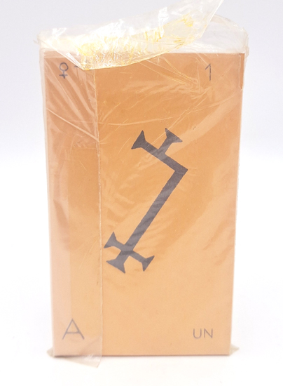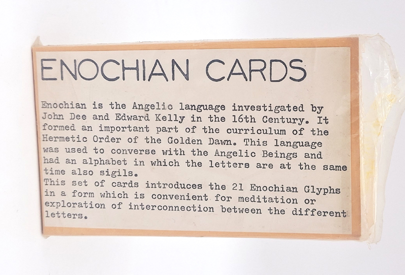 „Enochian is the Angelic language investigated by John Dee and Edward Kelly in the 16th Century. It formed an important part of the curriculum of the Hermetic Order of the Golden Dawn. […]. This set of cards introduces the 21 Enochian Glyphs in a form which is convenient for meditation or exploration of interconnection between the different letters“ (Paper insert). – The cards still in their plastic foil.