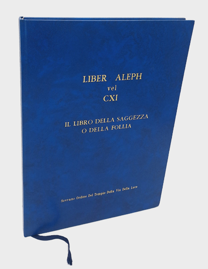 Liber Aleph Vel CXI Il Libro della Saggezza o della Follia, in forma di Epistola di 666 La Grande Bestia Selvaggia a suo Figlio 777 (The Equinox Volume III numero VI). S.·.O.·.T.·.V.·.L.·. (Sovrano Ordine Del Tempio Della Via Luce), Novara [1994]. [First Edition]. 4° [303 x 217 mm]. xiii, [1] w., 1 Bl., 217, [1] w. S. Blue leatherette with gold embossing on cover and spine.