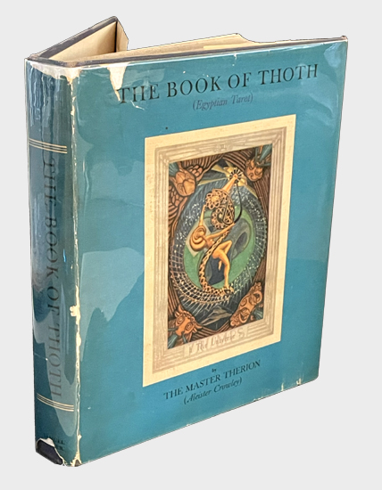 Crowley, (leister (eigentl.: Edward Alexander C.): The Book of Thoth. A Short Essay on the Tarot of the Egyptians. Being The Equinox Volume III No. V by The Master Therion. Samuel Weiser, Inc., New York 1969. Gr.-8°. With many black & white illustrations and seven color illustrations. xii, 287, [1] w., 2 (w) Bl. Blue cloth with gilted embellishments on the spine in maylar-protected dustjacket.