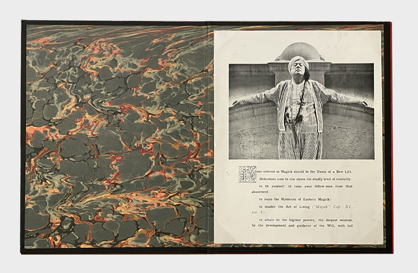 Although sometimes found with copies of “Magick in Theory and Practice” (Book 4, Part IV, published in 1930) the leaflet was apparently issued later in the 1930s from England. The address – 9 Carlos Place Grosvenor Square – is that given by Crowley at the time of the Nina Hamnett libel action (April 1934) so the leaflet was presumably issued around then. The text of the leaflet invites those interested in Magick, Crowley’s creed of Thelema, or discovering their own “true will” to make contact with him. – A little light creasing, otherwise a very good copy. Very scarce.