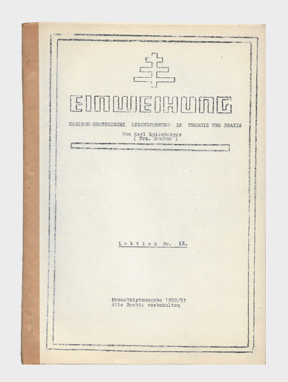 Einweihung. Magisch-esoterische Lebensformung in Theorie und Praxis. Lektion Nr. IX. Privatdruck / Manuskriptausgabe o.O., 1952/58. 4°. 1 Bl., 13, [1] S. Typoskriptdruck mit Klammerheftung und Fälzelstreifen.