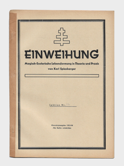 Einweihung. Magisch-esoterische Lebensformung in Theorie und Praxis. Lektion Nr. XI. Privatdruck / Manuskriptausgabe o.O., 1952/58. 4°. 1 Bl., 13, [1] w. S. Typoskriptdruck mit Klammerheftung und Fälzelstreifen.