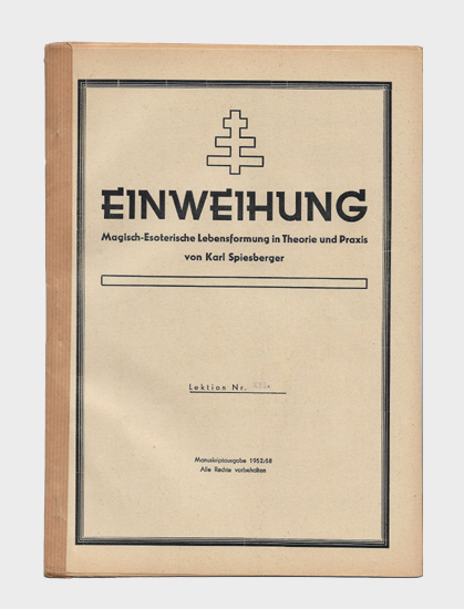 Spiesberger, Karl (Fra. Eratus): Einweihung. Magisch-esoterische Lebensformung in Theorie und Praxis. Lektion Nr. XII. Privatdruck / Manuskriptausgabe o.O., 1952/58. 4°. 1 Bl., 14 S. Typoskriptdruck mit Klammerheftung und Fälzelstreifen.