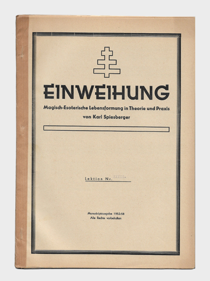 Einweihung. Magisch-esoterische Lebensformung in Theorie und Praxis. Lektion Nr. XXIII. Privatdruck / Manuskriptausgabe o.O., 1952/58. 4°. 1 Bl., 13 S. Typoskriptdruck mit Klammerheftung und Fälzelstreifen.
