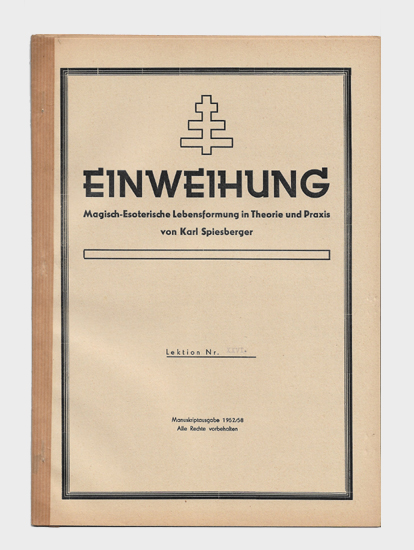 Spiesberger, Karl (Fra. Eratus): Einweihung. Magisch-esoterische Lebensformung in Theorie und Praxis. Lektion Nr. XXVI. Privatdruck / Manuskriptausgabe o.O., 1952/58. 4°. 1 Bl., 14 S. Typoskriptdruck mit Klammerheftung und Fälzelstreifen.