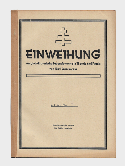 Spiesberger, Karl (Fra. Eratus): Einweihung. Magisch-esoterische Lebensformung in Theorie und Praxis. Lektion Nr. XXIX. Privatdruck / Manuskriptausgabe o.O., 1952/58. 4°. 1 Bl., 14 S. Typoskriptdruck mit Klammerheftung und Fälzelstreifen.