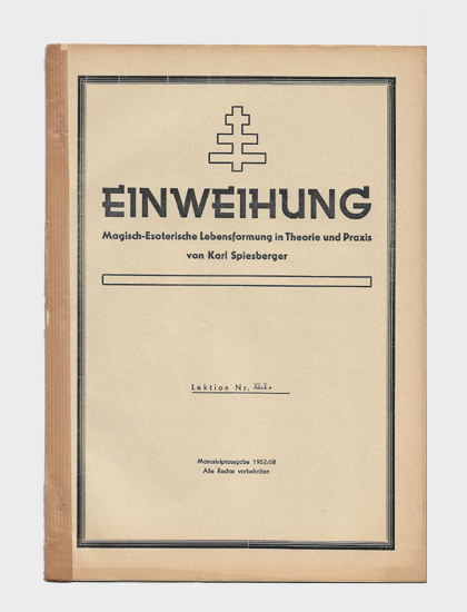 Einweihung. Magisch-esoterische Lebensformung in Theorie und Praxis. Lektion Nr. XXXVIII. Privatdruck / Manuskriptausgabe o.O., 1952/58. 4°. 1 Bl., 14 S. Typoskriptdruck mit Klammerheftung und Fälzelstreifen.
