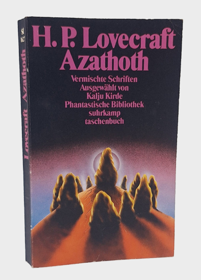 Azathoth. Vermischte Schriften. Suhrkamp Verlag, Frankfurt am Main 1989. Erste Auflage. Ausgewählt von Kalju Kirde. Aus dem Amerikanischen von Franz Rottensteiner. 310 S., 1 Bl., 4 Bl. Vlgs.-Anz. Illustr. OKarton.