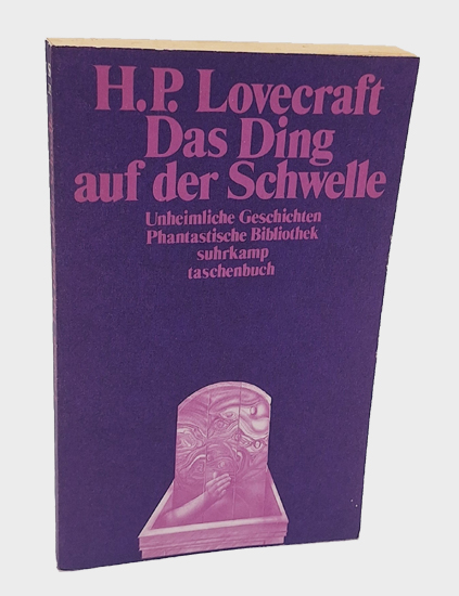 Lovecraft, H[oward] P[hilips]: Das Ding an der Schwelle. Unheimliche Geschichten. Suhrkamp Verlag, Frankfurt am Main 1976. Erste Auflage. Deutsch von Rudolf Hermstein. Mit einem Nachwort von von Kalju Kirde. 210 S., 1 Bl., 6 Bl. Vlgs.-Anz. Illustr. OKarton.