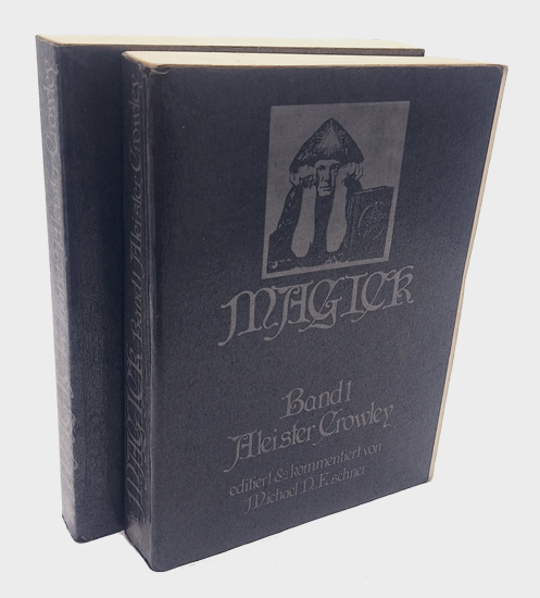 Magick. Band I & Band II. Petra Schulze Verlag & Versand, Clenze 1992. 7. Auflage. Editiert und kommentiert [u. teilw. übersetzt] von M[ichael] D[ietmar] Eschner. 545 S., 7 Bl. Vlgs.-Anz.; 364 S., 6 Bl. Vlgs.-Anz., 1 [w] illustr. OKarton Bände.