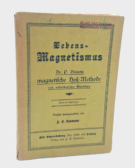 Die Heilkraft des Lebens-Magnetismus. Dr. P. Brauns magnetische Heil-Methode nach wissenschaftlichen Grundlagen. Verlag von F[riedrich] E[duard] Baumann, Bad Schmiedeberg (Bez. Halle) und Leipzig o.J. [um 1910]. Zweite Auflage. Deutsch herausgegeben von F. E. Baumann. 79, [1] S. OKarton.