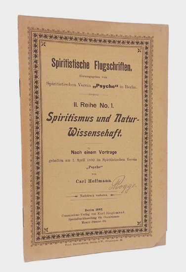 Hoffmann, Carl: Spiritistische Flugschriften. II. Reihe No. 1. Spiritismus und Natur-Wissenschaft. Commissionsverlag von Karl Siegismund, Berlin 1892. 15 S. OBroschur.